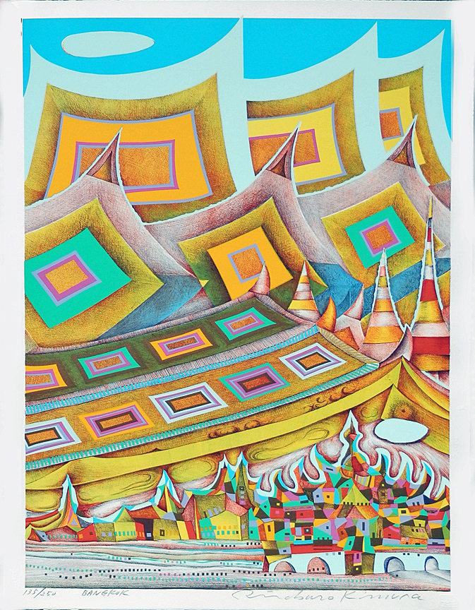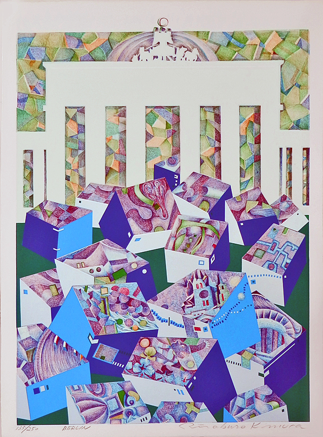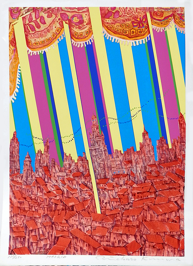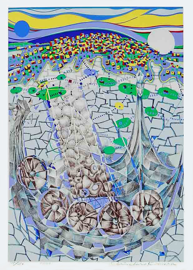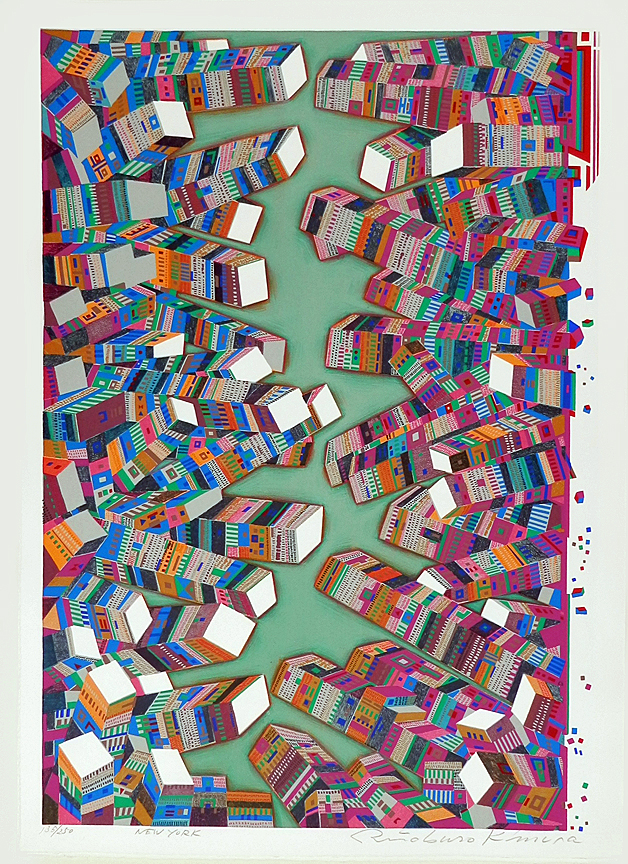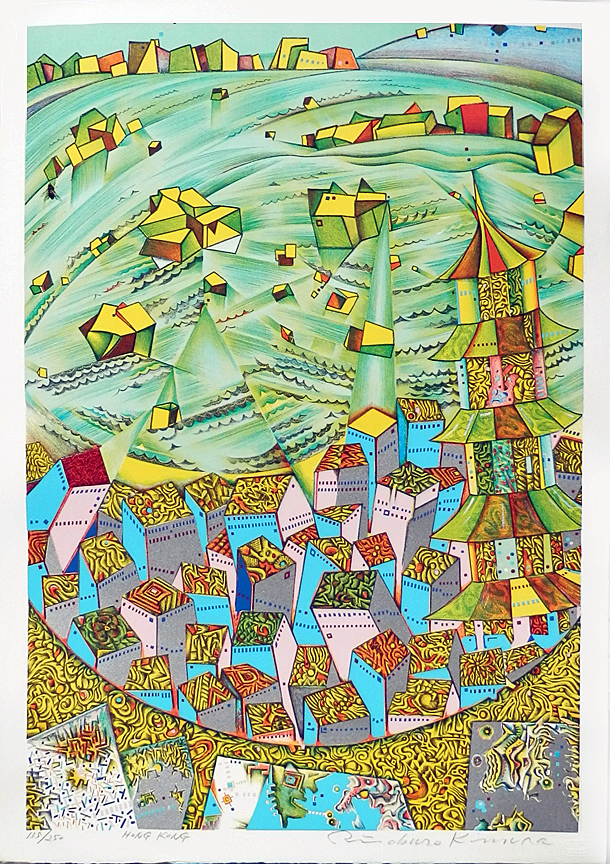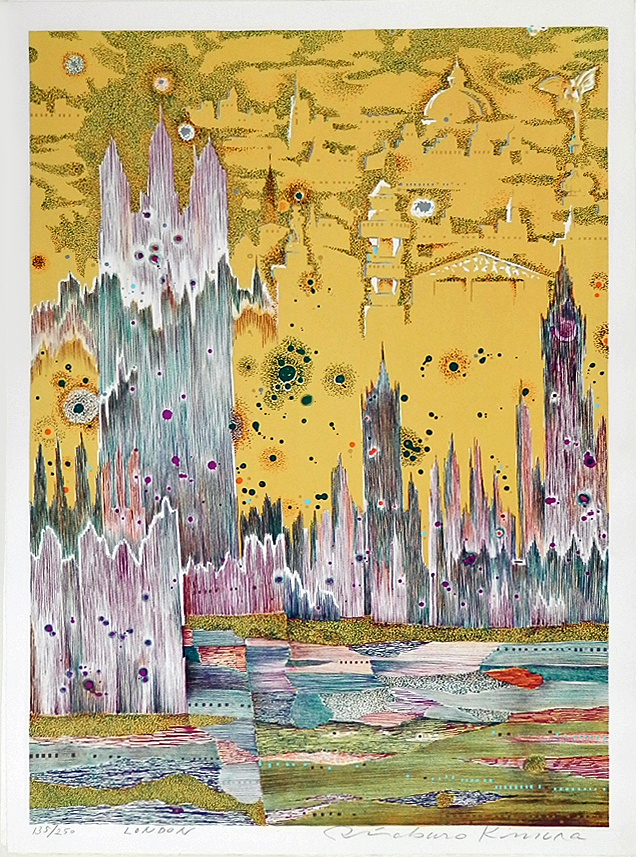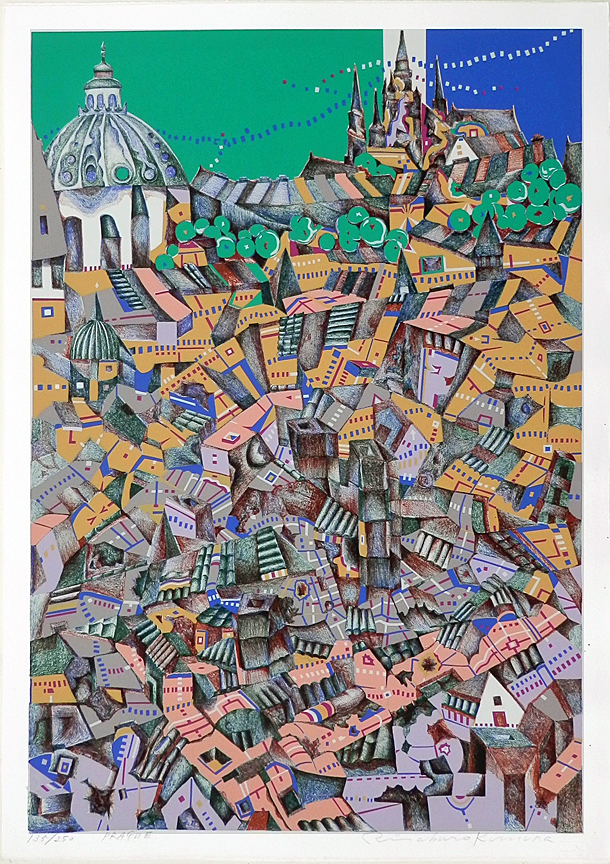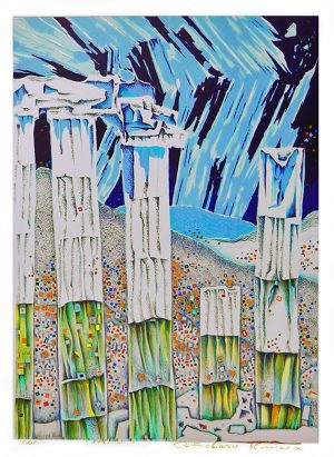 “ATHENS” is a print from the suite of 20 mixed media prints, depicting the artist’s interpretation of each city, was entirely hand produced by the artist. The image size of each print is 28″ X 20″ plus margins in an edition of 250.